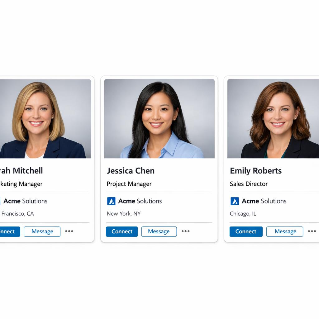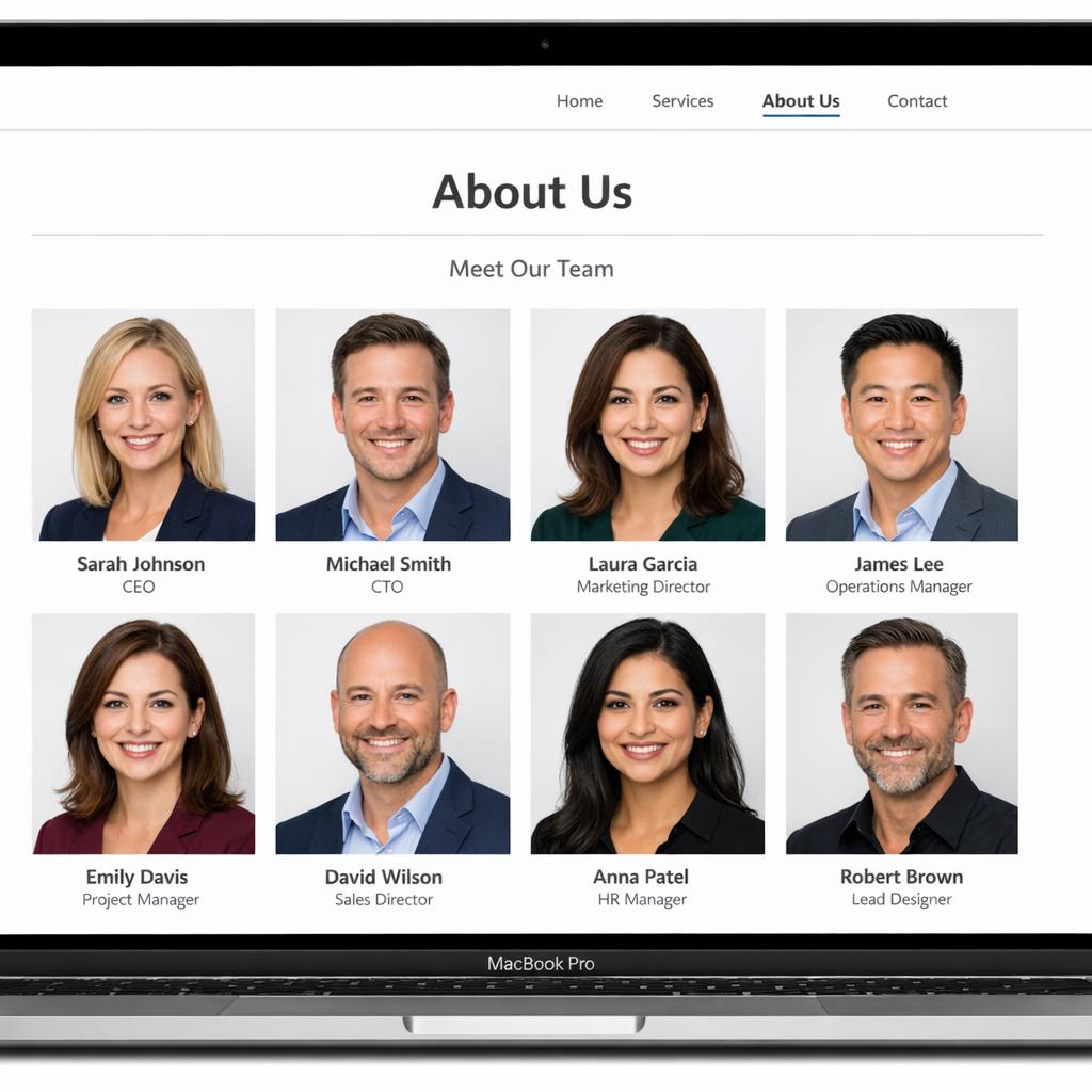 When employees submit their own photos, you get exactly what you'd expect: bathroom selfies next to professional headshots. Ring light reflections next to natural daylight. Vacation photos next to LinkedIn defaults. The result screams "disorganized" to clients and candidates.