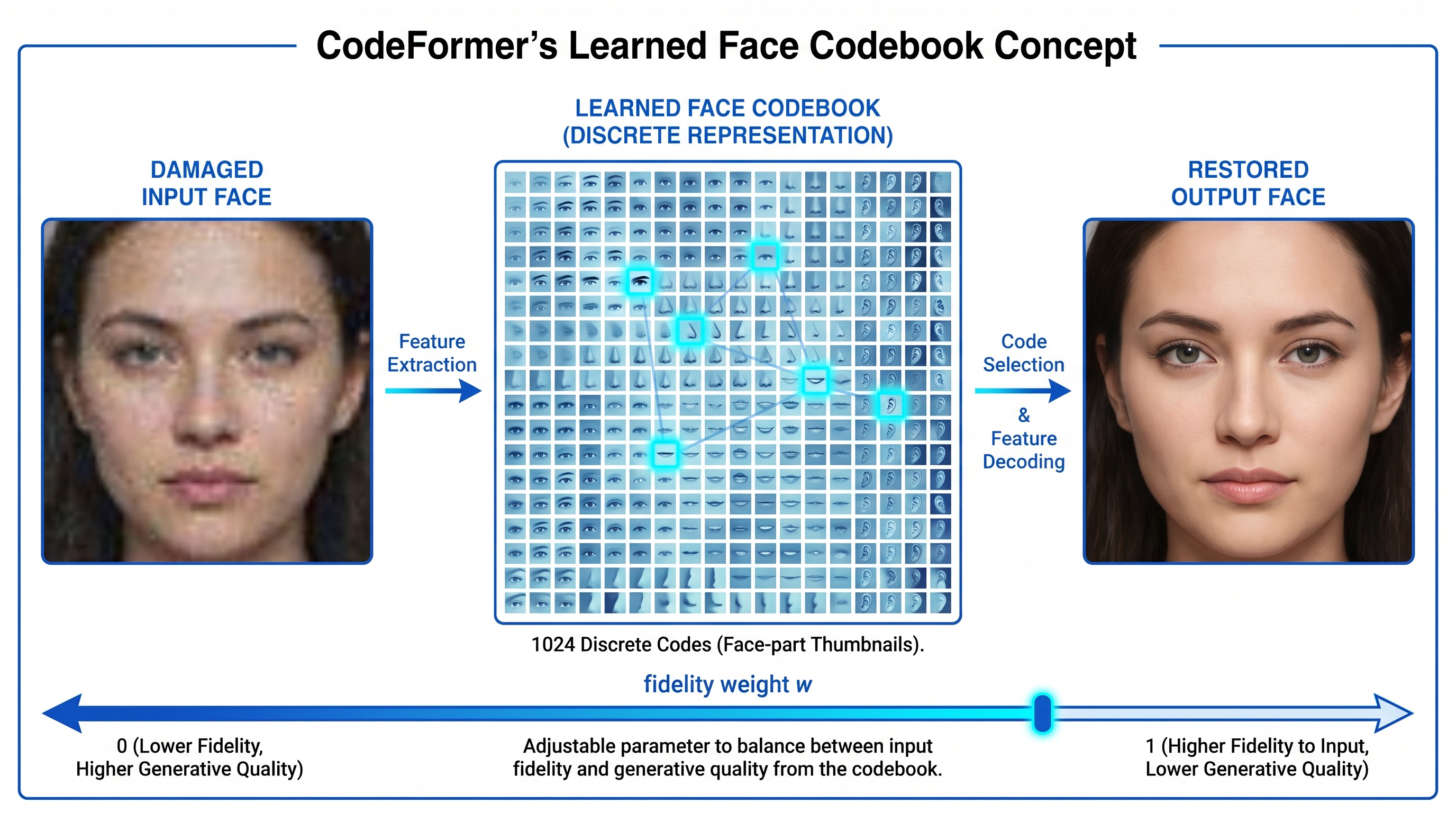 CodeFormer is a representative example of how this generation of face-restoration models works. It learns a library of face features — roughly a thousand eye, nose, and mouth patterns — during training. When it sees a damaged input, it picks the closest matches from that library and reconstructs the face from them. It's clever engineering. But fundamentally it's guessing what your grandmother's eyes looked like from a menu of eyes it's seen before. A frontier model has a much larger, more flexible understanding of faces and doesn't have to fall back to a fixed menu.