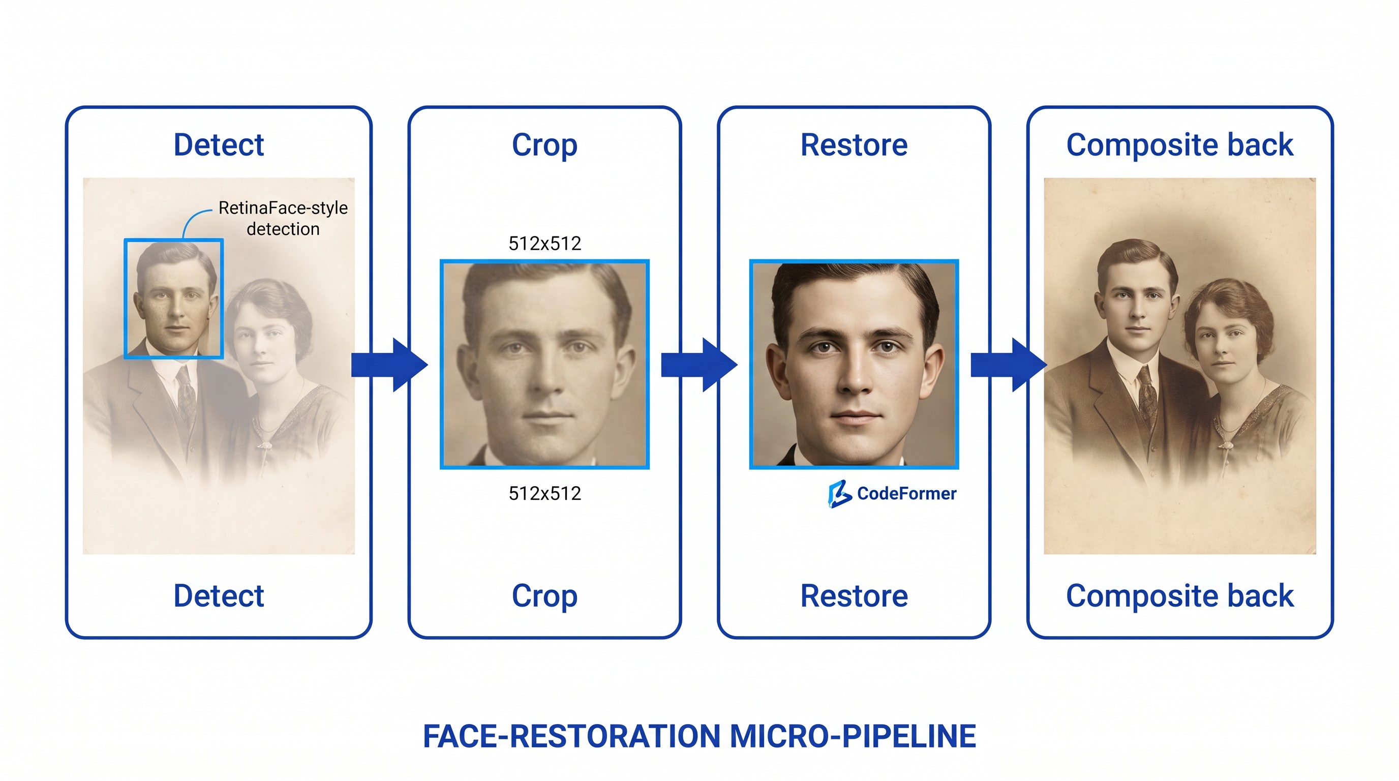 Faces get their own mini-pipeline inside the bigger one, because human eyes are brutally sensitive to face quality. In older tools, every face is detected, cropped out to a fixed size, sent through a face-specific model, then blended back into the main image.