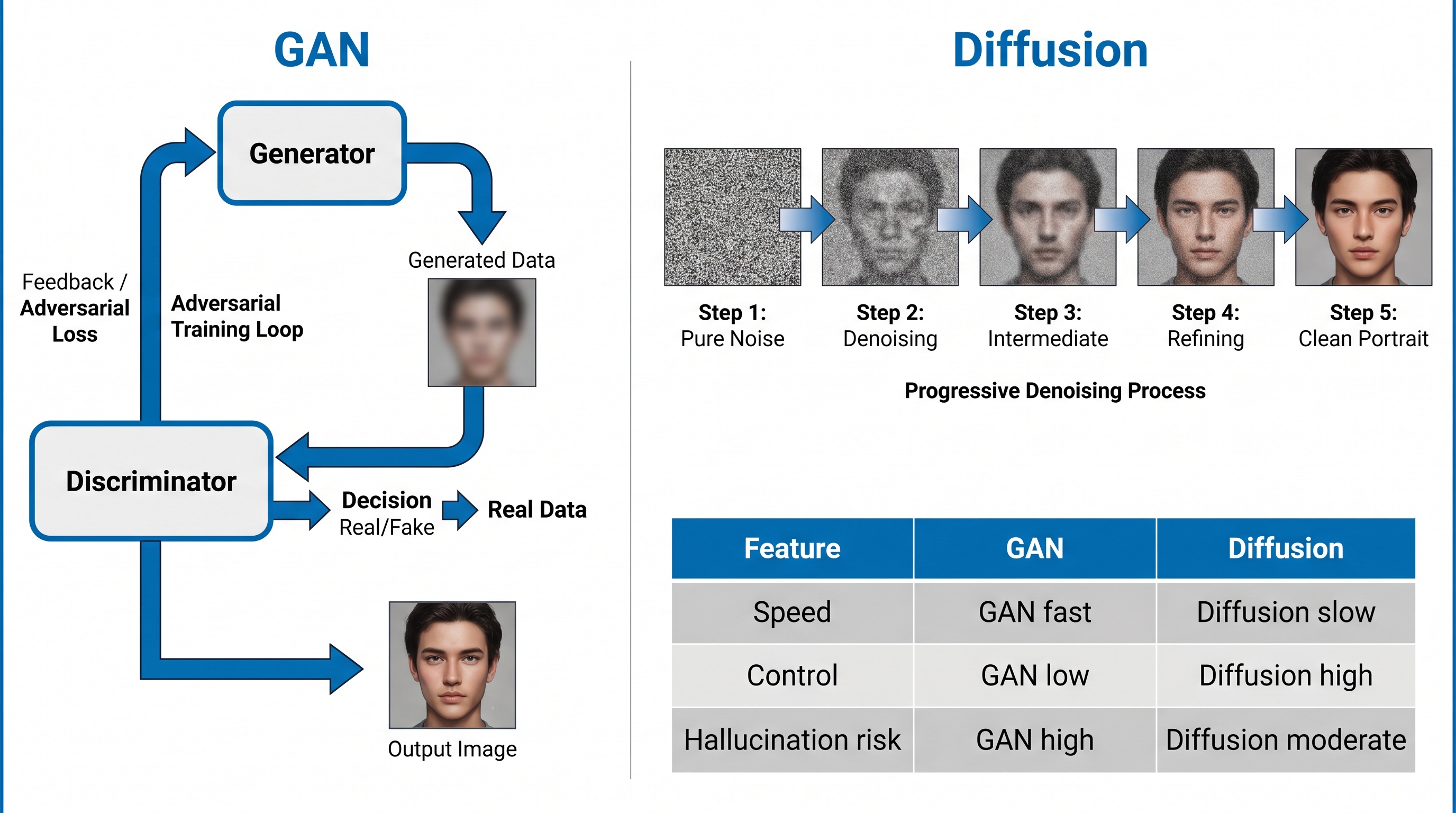 The older restoration tools are mostly built on GAN-based models — an earlier generation of image AI that's fast but tends to hallucinate confidently when uncertain. The newer frontier models are diffusion-based, which is both more controllable and better at knowing what it doesn't know. That's the underlying reason newer tools produce fewer "made-up" features in the final result.
