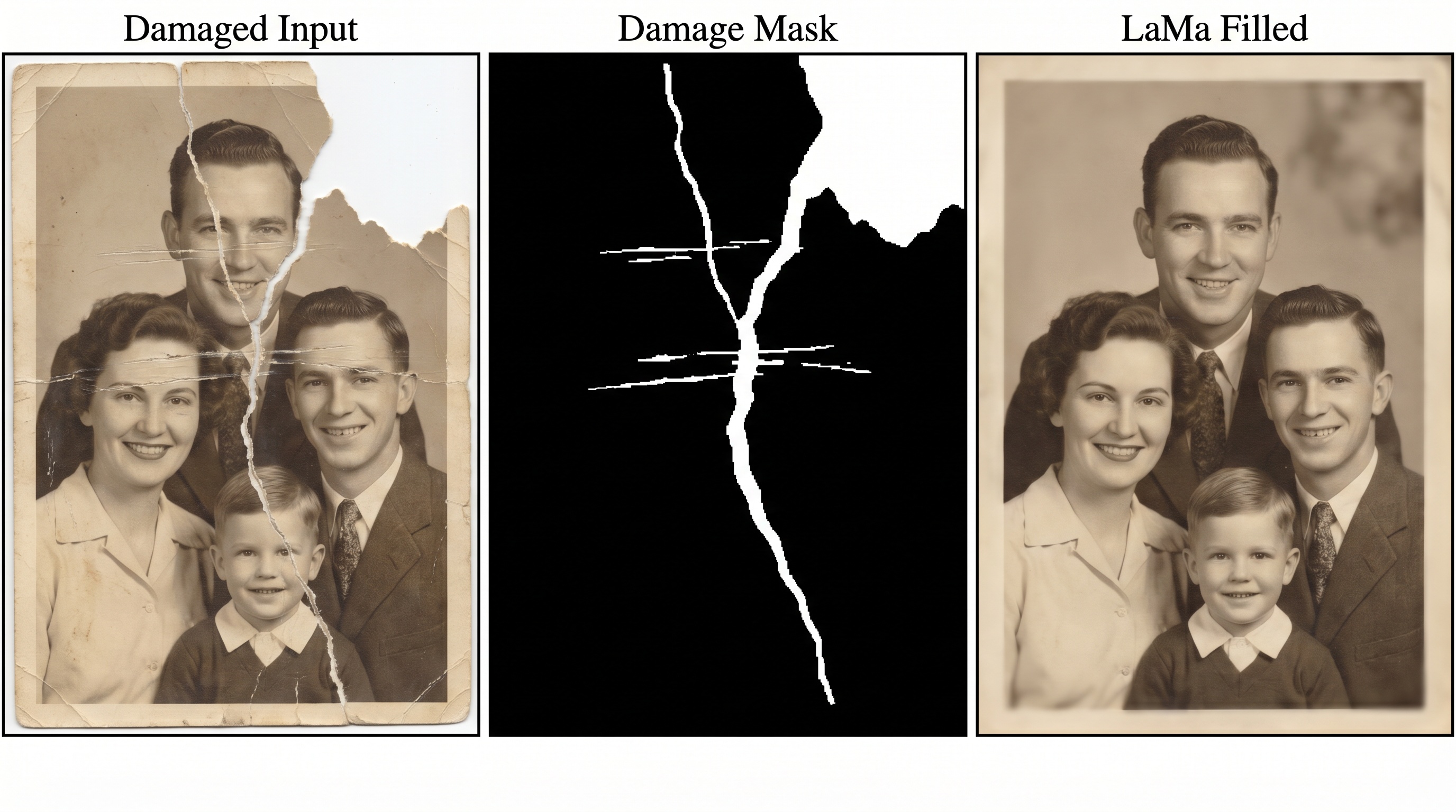 - Inpaint damage. Detect scratches, tears, and missing patches, then fill them using the surrounding context.