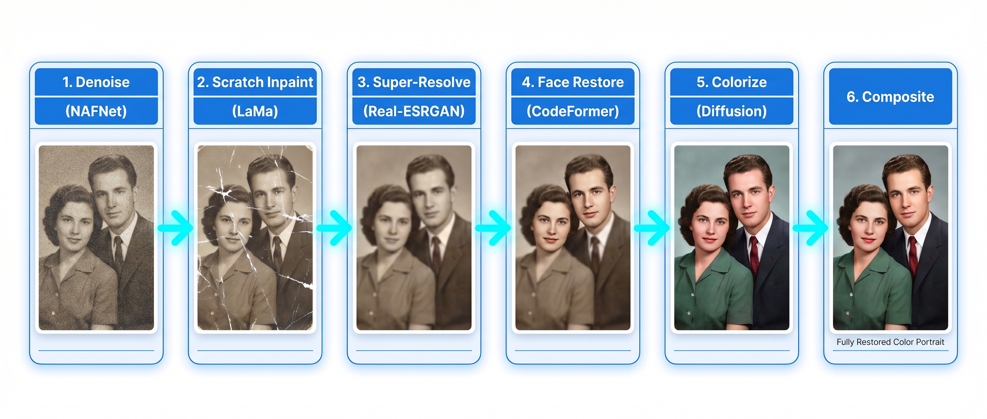 Most restoration products you've heard of — the big mainstream apps, the heritage brands, the GitHub-based indie tools — share roughly the same architecture under the hood. A damaged photo goes in on one side, and it passes through six stages before coming out the other. Each stage is a different small model doing one narrow job.