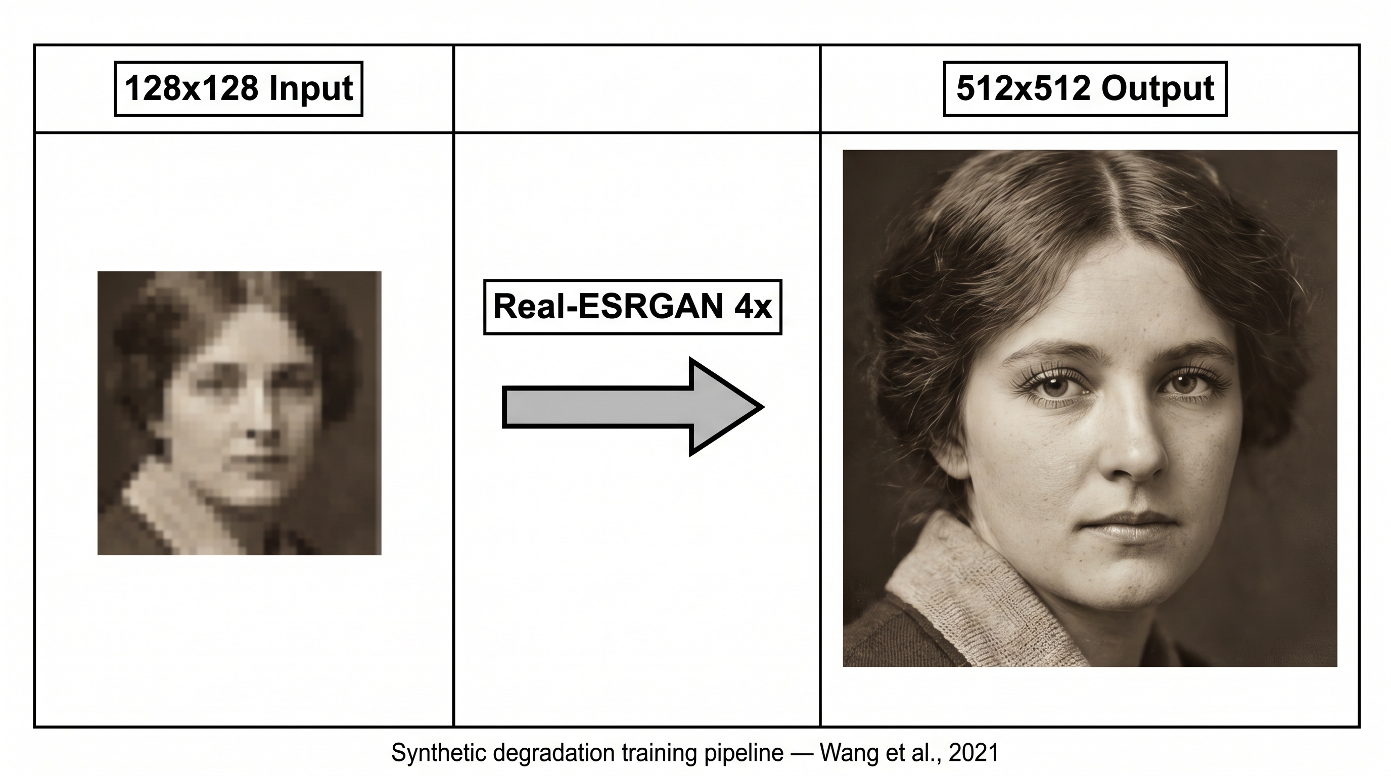 Each of those stages is typically handled by a separate open-source model — names you may have seen if you've looked under the hood of other tools: Real-ESRGAN for upscaling, CodeFormer or GFPGAN for faces, LaMa for scratch filling, DeOldify for colorization. They're capable pieces of software, and the researchers who built them did excellent work. But they were each designed to solve one narrow problem, and they have to be stitched together to restore a whole photo.