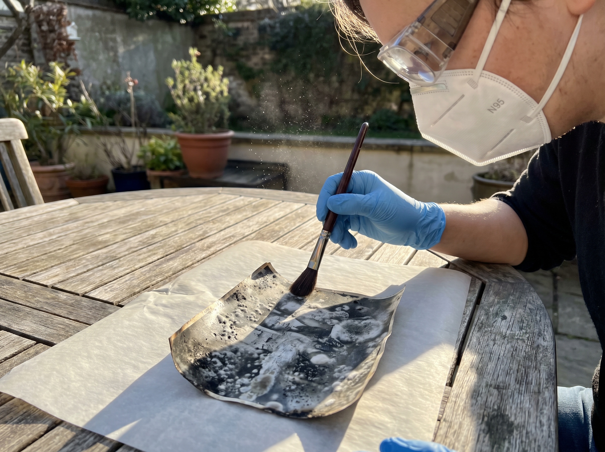 This is the one technique you absolutely have to do outdoors. Mold spores become airborne the moment you brush them. Indoors, you're just contaminating your house.