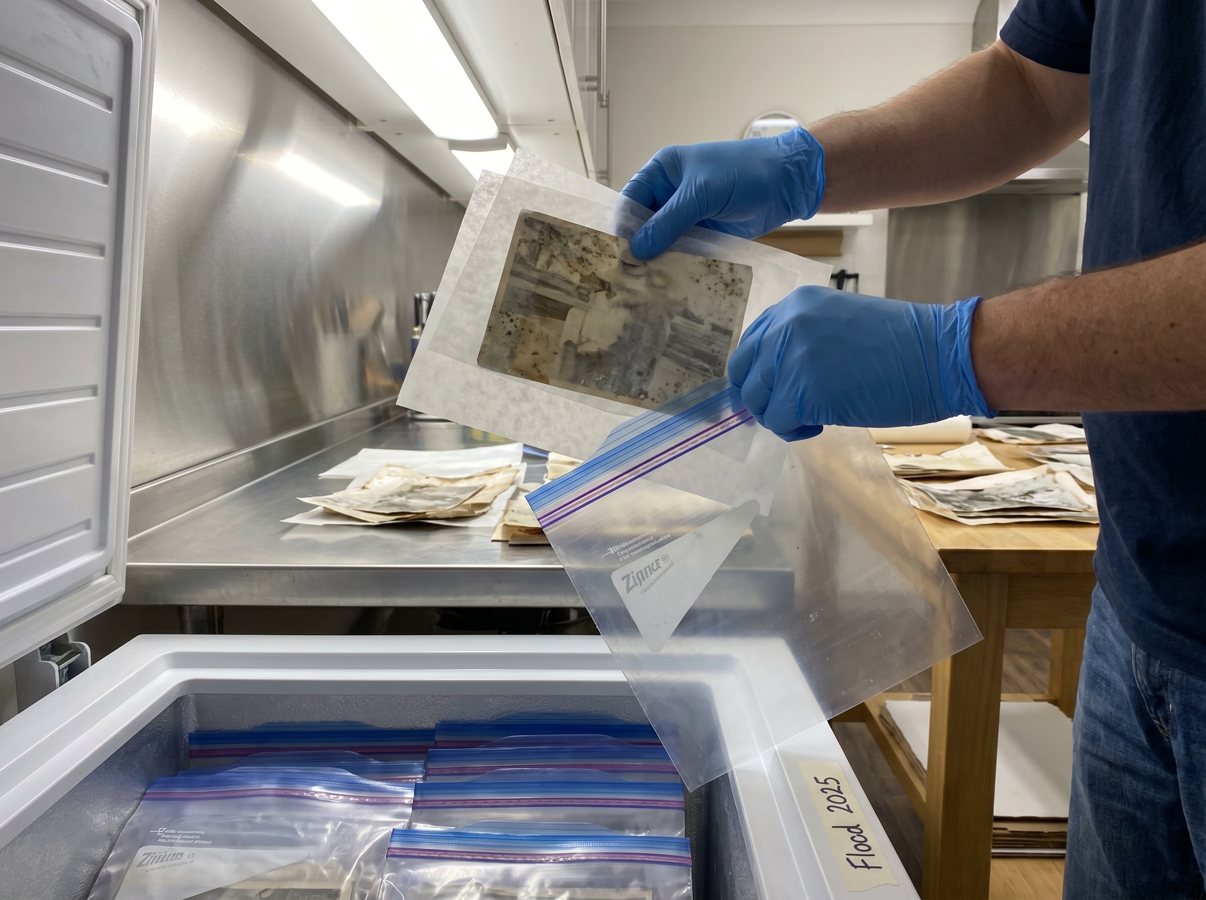 - Step 2c: Freeze at 0°F (-18°C). Freezing halts mold metabolism and stops emulsion fusion. The National Archives has recovered photos frozen for months this way.