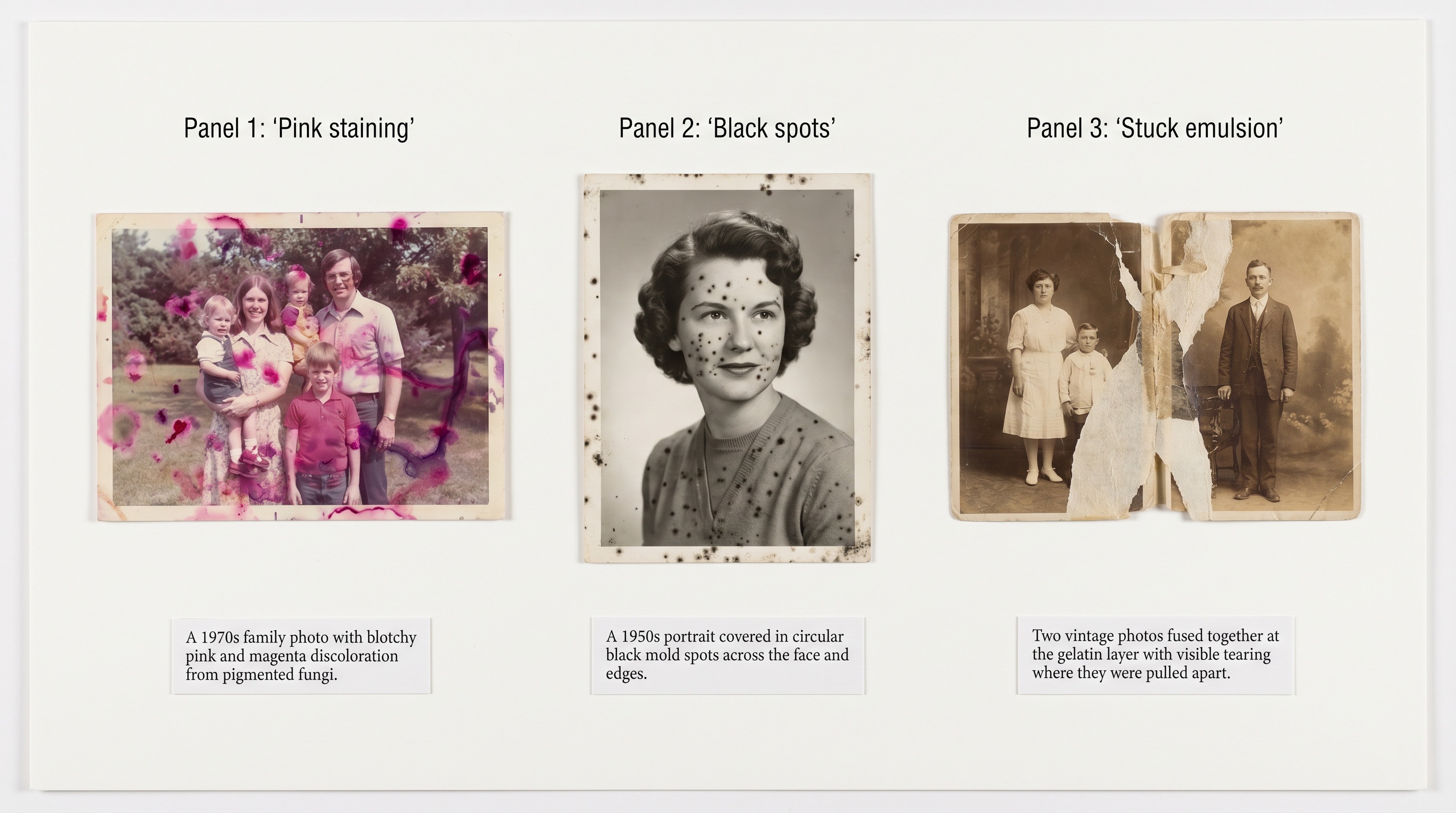 - Fusion. Moldy photos in a humid stack become glued together at the emulsion layer. Pulling them apart rips image detail off one and onto the other. Conservators will sometimes freeze and then slowly peel these; amateurs usually shouldn't.