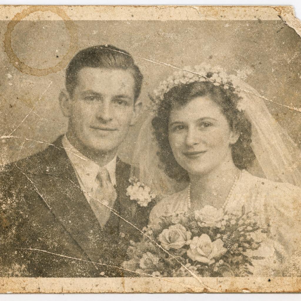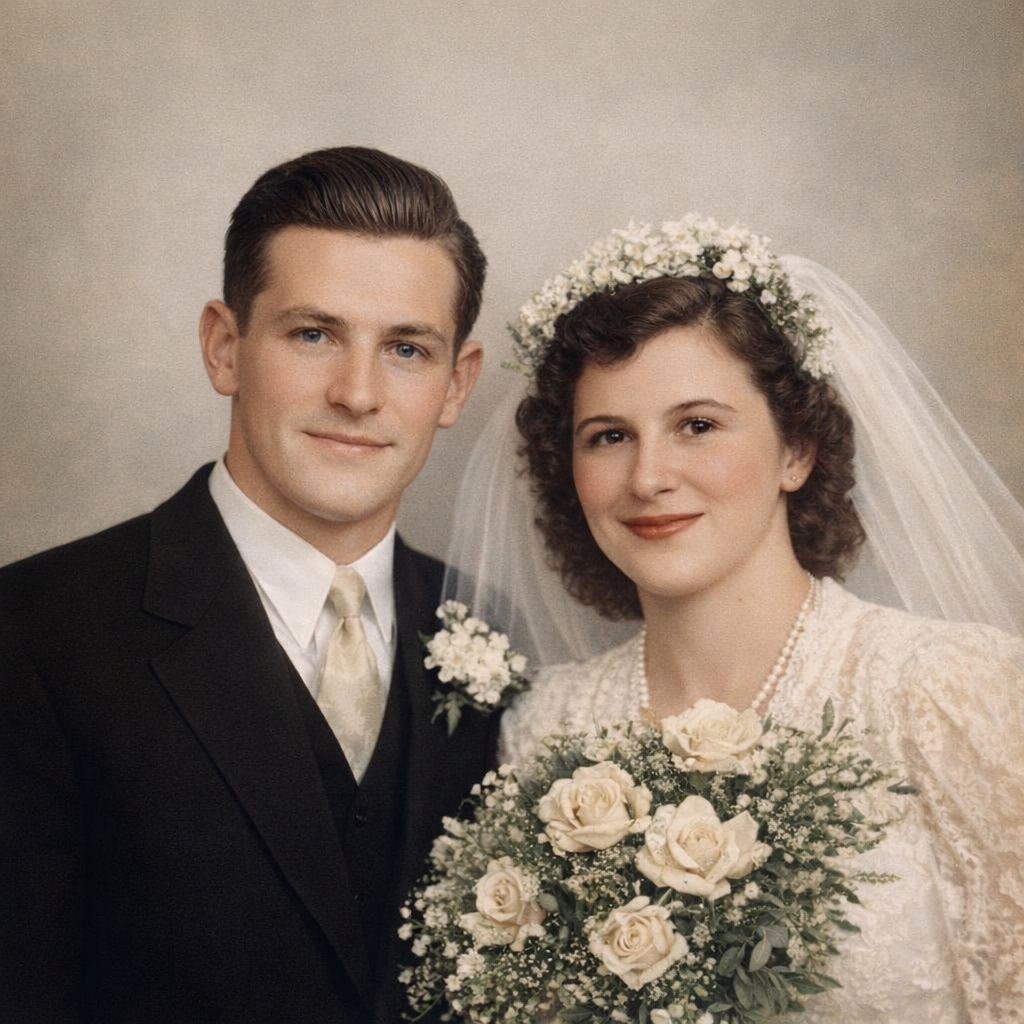 1940s wedding photo restored and colorized. Scratches removed, contrast restored, faces sharpened.