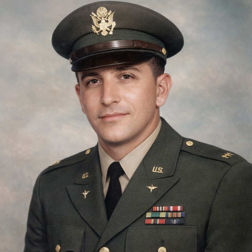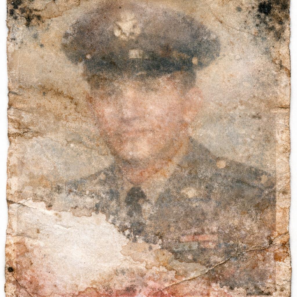 Military portrait nearly destroyed by flooding. AI reconstructed washed-out areas and removed stains.
