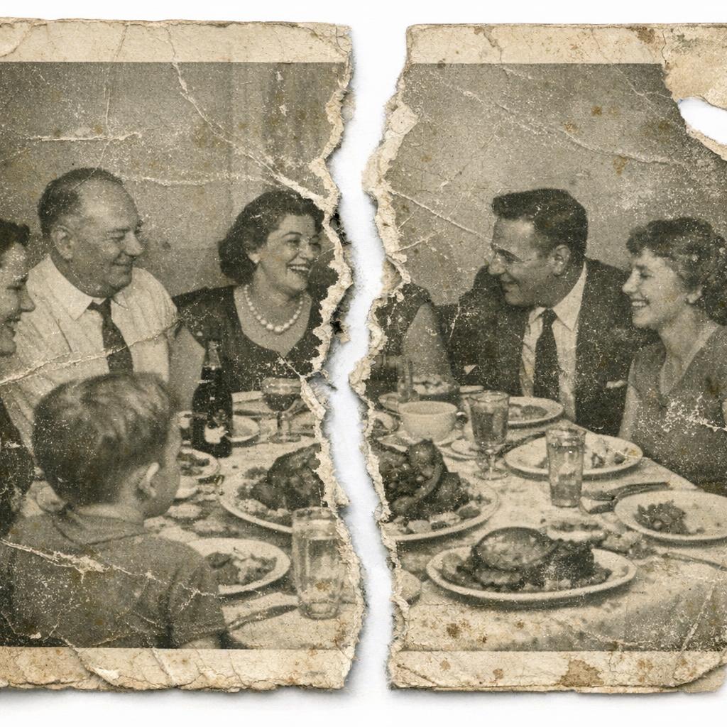 Family dinner photo torn in half. AI seamlessly merged the pieces and filled the missing section.