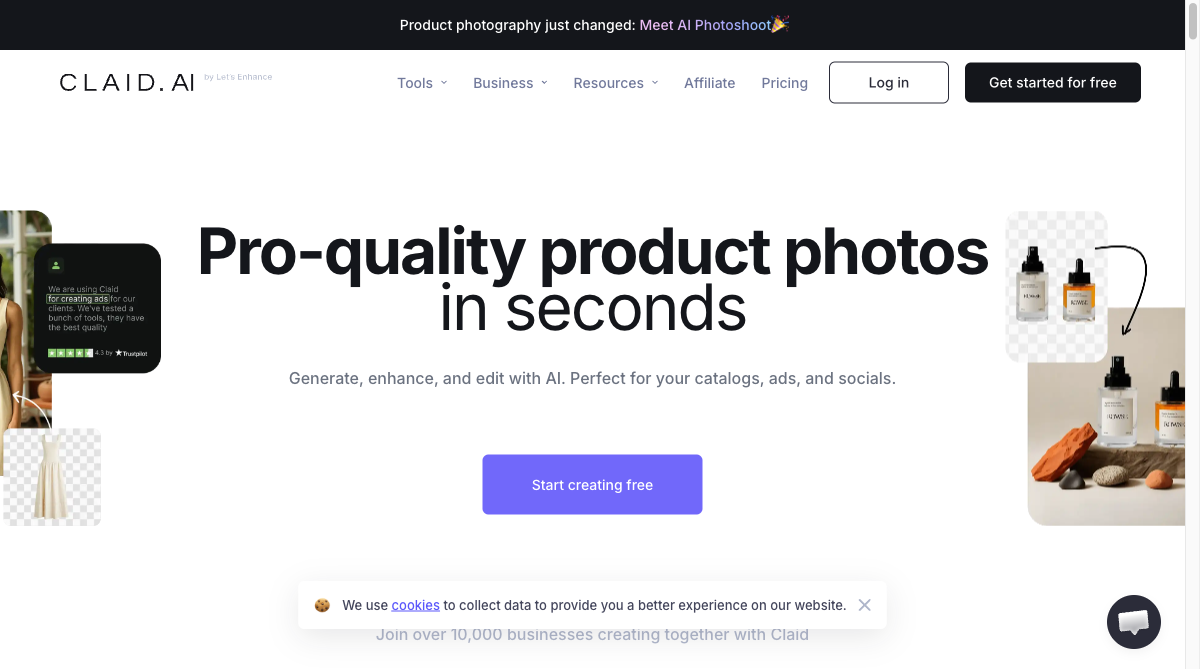 Claid.ai is built specifically for e-commerce product photography and it shows. The AI Photoshoot feature takes a simple product photo and generates full campaign imagery including clean catalog shots and lifestyle scenes with correct lighting, shadows, and textures. The platform excels at maintaining product detail during background removal and color correction, making it a strong choice for catalog-heavy businesses.